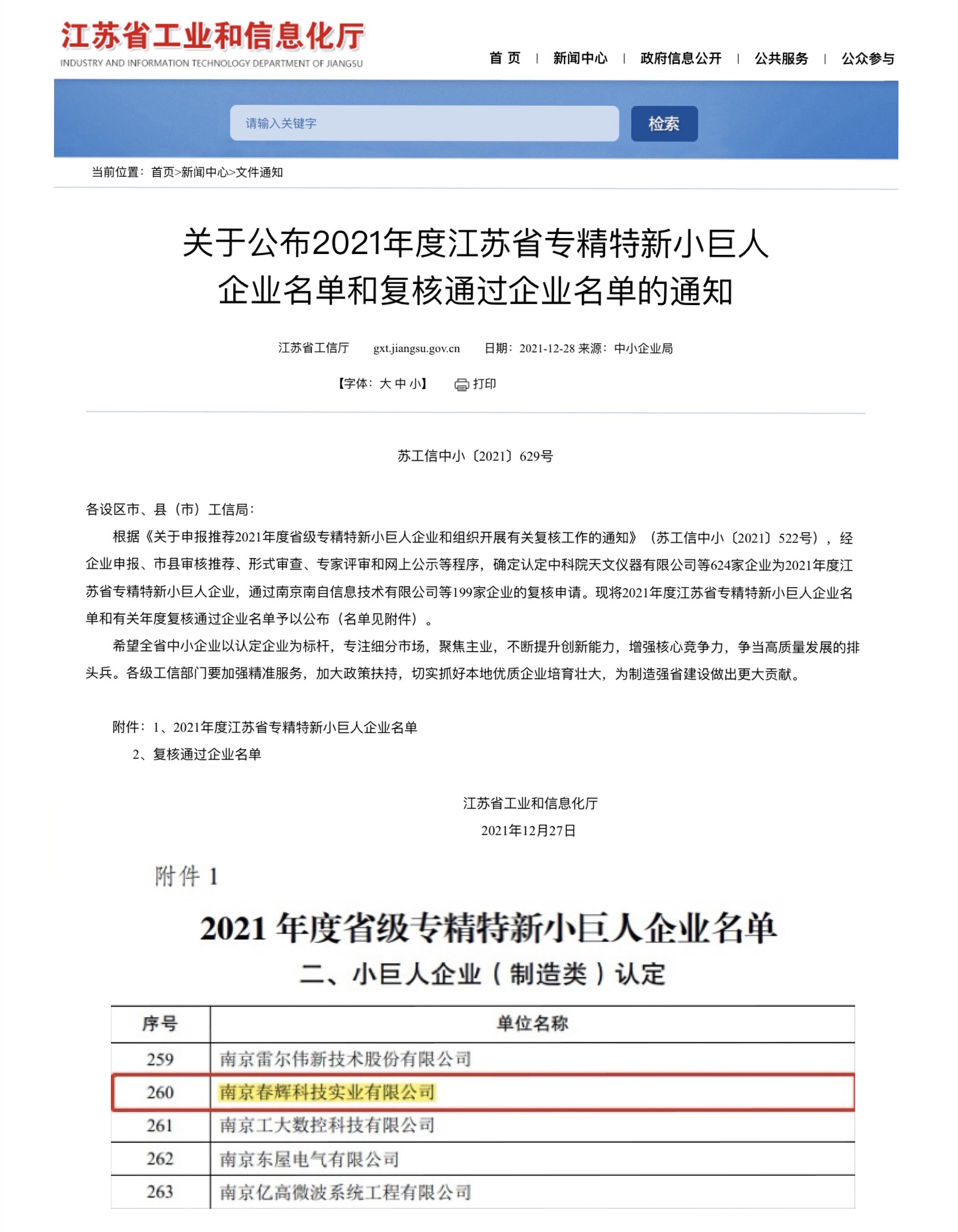 2021年12月27日,江蘇省工業和信息化廳發布《關于公布2021年度省專精特新小巨人企業名單和復核通過企業名單的通知》,其中南京市僅認定了62家,南京春輝科技實業有限公司脫穎而出,被認定為江蘇省專精特新“小巨人”企業。