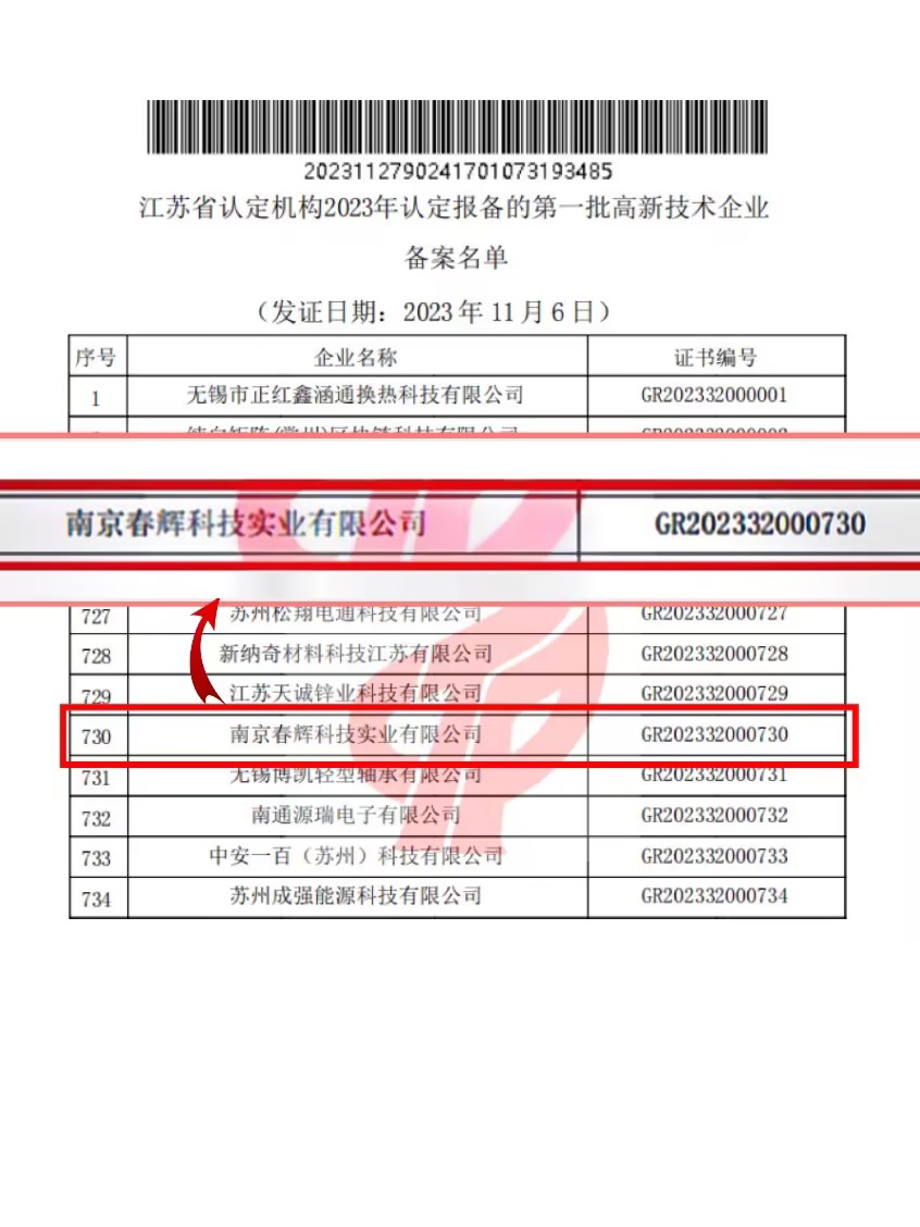 11月27日,根據《高新技術企業認定管理辦法》和《高新技術企業認定管理工作指引》有關規定,全國高新技術企業認定管理工作領導小組辦公室發布了江蘇省認定機構2023年認定報備的第一批高新技術企業名單,春輝公司順利通過復審認定,再次被授予國家高新技術企業稱號。